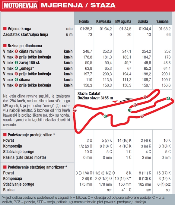 Pravo stanje stvari pokazat će se na cestama oko španjolskog mjestašca Calafata, gdje okolna brda obiluju prekrasnim, uskim i zavojitim cestama na kojima će peterac pokazati sve svoje vrline, ali i mane. No, svima je jasno da se mogućnosti ovih sportaša ne mogu u punom opsegu iskoristiti u vožnji na cesti, pa su stoga predviđena i dva dana vožnje po trkaćoj stazi. Izbrazdana i naborana pista što obiluje 'pravim kutevima' izdvojit će vrijedno od manje vrijednoga, a da naši motocikli ne bi na ovoj vježbi ostali bez svoje serijske 'obuće', koristit ćemo potpuno novi model guma Michelin Power Race u mješavini medium-soft. Zato žurno navlačimo kožne kombinezone, punimo spremnike bezolovnim eurosuperom 'do čepa' i akcija počinje.
