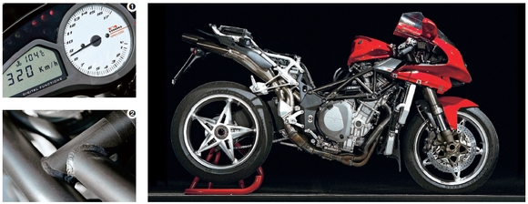 Početkom 90-ih ovakva se koncepcija smatrala uobičajenom, a oznaka sport značila je oskudijevanje i mučenje. No, 2005. situacija je drukčija pa su atributi koji krase moderne japanske superbikeove - kratki, čvrsti, opušteni. No, o tome MV Agusta ne želi ni čuti. MV je MV i gotovo! Gotov je i najuporniji vozač nakon 200 km vožnje na cesti, a za povratak u stanje normale potrebni su mu sauna, topla kupka i masaža. Ipak, glavne su Agustine odlike nevjerojatno ugodan zvuk koji ispuštaju kvartet ispušnih cijevi i snažni pogonski agregat s radijalno upravljanim ventilima. Doduše, ispod 7000 okretaja Agusta komandu gasa ne shvaća uvijek previše ozbiljno. Nakon 8000 okretaja 'bella donna' diše punim plućima, što vozač osjeća po njenim jedrim vibracijama.